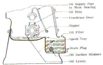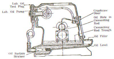 Lubrication is by a plunger type pump operated by a cam on the camshaft. The pump feeds a generous supply of oil to the main bearings and to the trough into which the dipper of the connecting rod big end dips. The big end bearings are lubricated from below by a hollow dipper in the 12/2 & 16/2 engines, and by oil holes from above in the single cylinder engines. The piston, cylinder and other working parts are lubricated by splash.