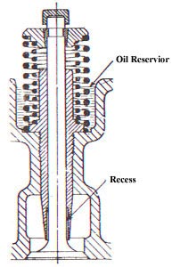 Near the valve tappets is a brass plug marked “OIL”. This is for applying oil to the camshaft bearing if the engine has been standing idle for a long time. Tappet heads and push rod heads are cupped to enable them to hold their own supply of oil for a reasonable time.
